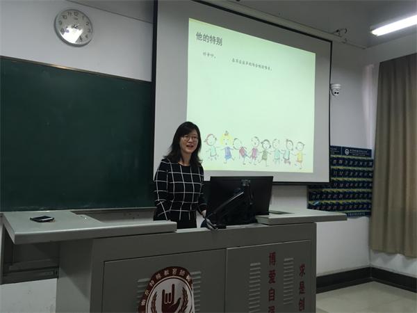当前,一部分特殊儿童以融合教育的方式选择在普通学校就读,如何做好融合班级的班级教育管理工作给班主任提出了新的要求,为了学习优秀班主任的带班经验,培养学生的班级管理能力,1113日下午,我院小学教育系邀请到南京市长江路小学优秀融合教育班主任周美娟老师,给17级小教专业师范生做了一场“手拉手,我们一起成长”的精彩报告。
