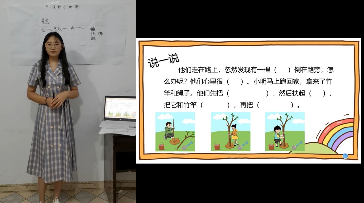 胡静文同学正在进行语文校内实习《保护小树苗》的模拟授课