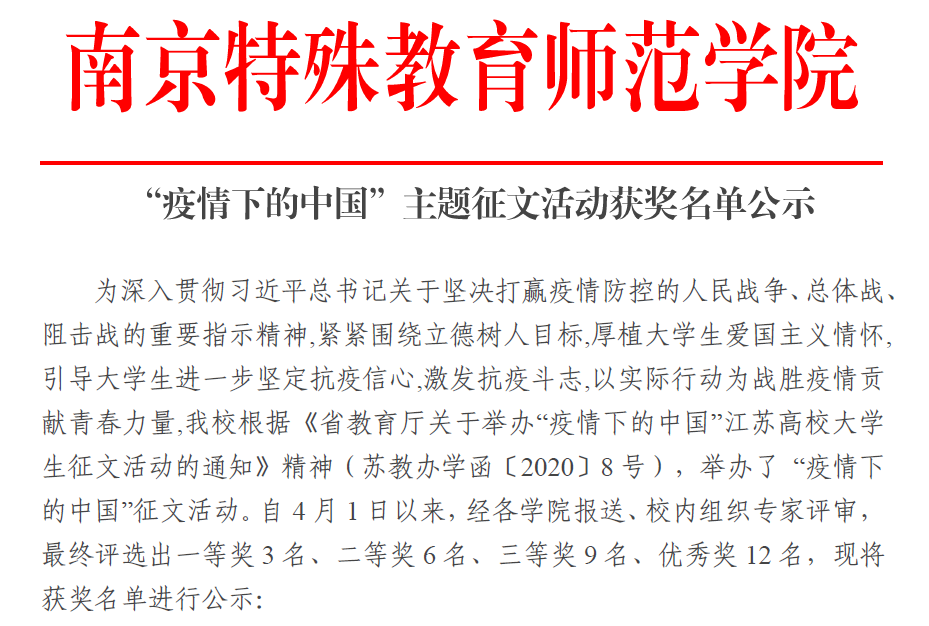 为深入贯彻习近平总书记关于坚决打赢疫情防控的人民战争、总体战、阻击战的重要指示精神,紧紧围绕立德树人目标,厚植大学生爱国主义情怀,引导大学生进一步坚定抗疫信心,激发抗疫斗志,以实际行动为战胜疫情贡献青春力量,我校举办了“疫情下的中国”征文活动。经过层层评选,我院18级卓越班杜京睿同学的《疫情下最“可爱”的人》荣获一等奖,余若愚等3名同学获二等奖,佘月辉等三名同学获三等奖,赵越等4名同学获优秀奖。