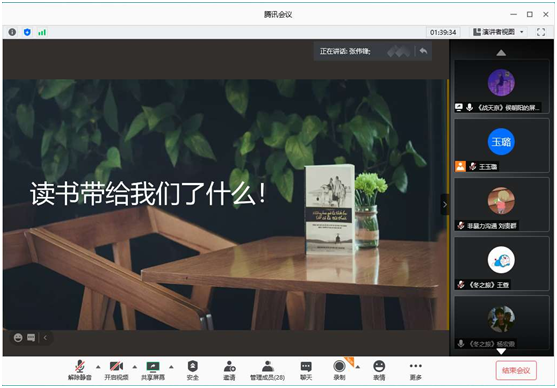 两周前,同学们先后组建了《平凡的世界》、《冬之旅》、《云边有个小卖部》、《我是猫》、《非暴力沟通》、《沉默的大多数》、《战天京》等七个线上阅读小组,对自己选择的书目进行充分阅读与思考,展开小组内的分享和交流。今天的活动主要分三部分。
