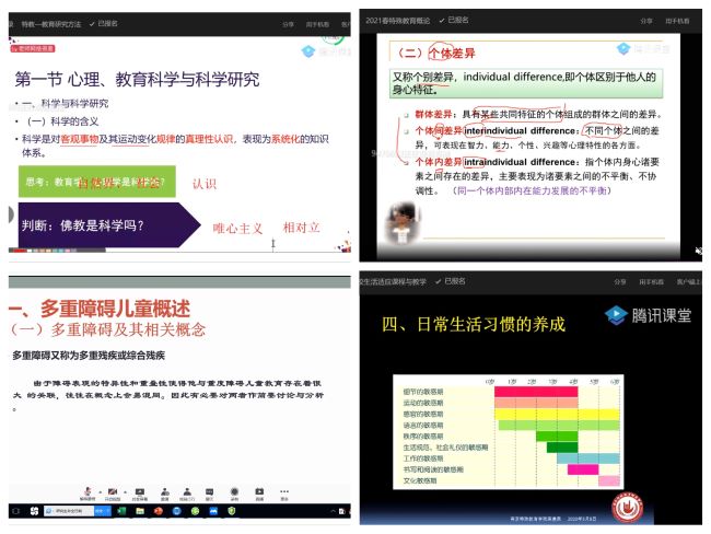 3月1日,特殊教育学院为期两周的线上教学正式开课,在线教学平稳推进,师生在线“云相聚”。老师们依据教学课表,按照教学计划,灵活运用腾讯会议、腾讯课堂、爱课程等教学平台,并结合QQ群、微信群等开展召集联络,师生在线互动自然、流畅,开启新学期的第一课。特殊教育学院党总支书记叶亮、副书记朱玉飞、副院长张伟锋、挂职副院长张九童及部分学院督导在线旁听了教师们的授课。