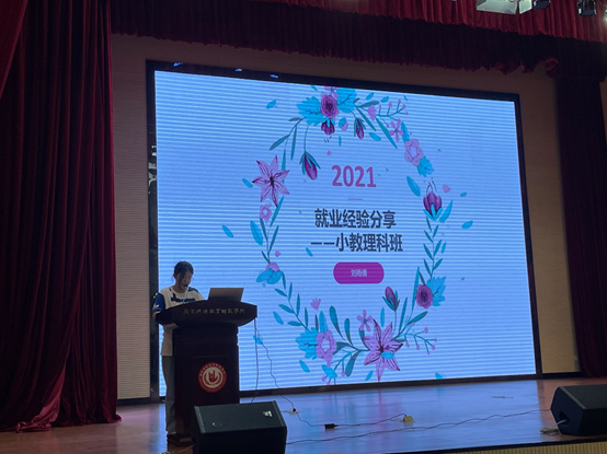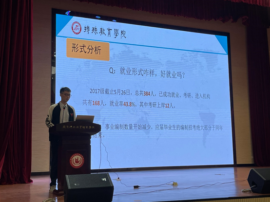 为了更好的指导学院2018级本科生未来的就业工作,更好的推进我院毕业生高质量就业,特殊教育学院召开了2018级本科生就业指导暨优秀毕业生经验交流分享会。学院党总支副书记朱玉飞、学工办邸鹏、2018级辅导员王赫煊、2017级优秀毕业生代表以及全体2018级同学参加了本次的分享会。本次活动由2018级辅导员王赫煊老师主持。