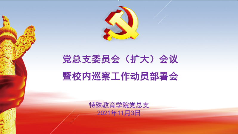 11月3日,特殊教育学院党总支召开扩大会议,研究部署十一月份党建工作和第四轮校内巡察准备工作。全体党总支委员和学院主持行政工作副院长李拉、学工办有关负责人参加会议,会议由党总支书记叶亮主持。