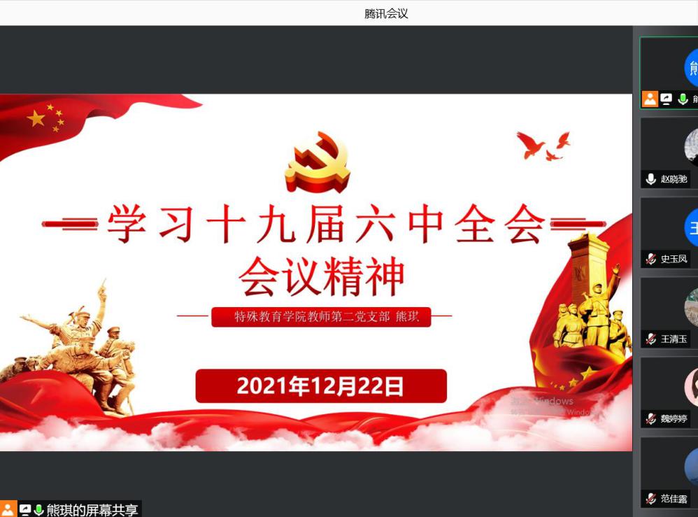 1222日晚,特殊教育学院教师第二党支部召开腾讯会议开展书记上党课活动,主题为学习党的十九届六中全会精神。教师第二党支部书记熊琪从会议成果、会议强调的“两个确立”、习近平新时代中国特色社会主义思想的核心内容、“十个坚持”总结党百年奋斗的历史经验以及学习体会五个方面进行了说明,带领大家重温了十九届六中全会的会议内容和精神实质。