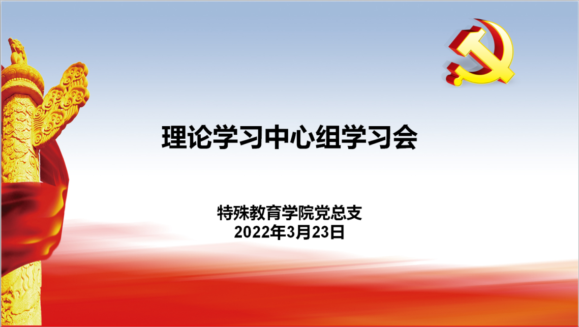 3月23日下午,特殊教育学院党总支召开理论学习中心组专题学习会,重点学习全国两会期间习近平总书记重要讲话精神,政府工作报告主要内容特别是关于教育的工作部署。会议由党总支书记叶亮主持,特殊教育学院全体党总支委员及科级以上干部参加会议,院长助理慕雯雯列席参加。