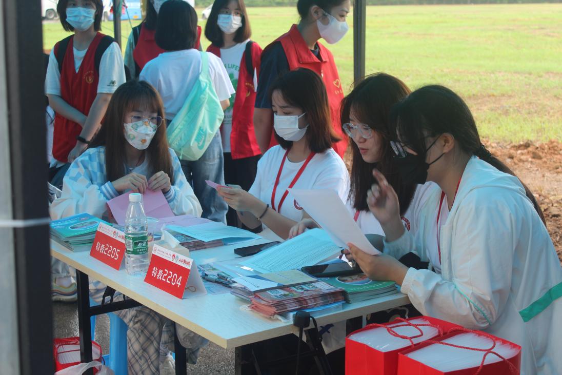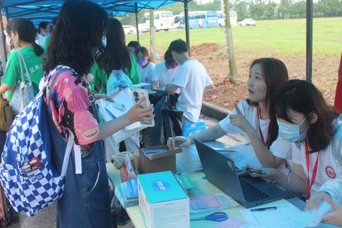 到达江宁校区后迎新工作有条不紊地开展。志愿者引导新生做核酸、带领他们核验报到资料、发放定制文具、办理入住手续、讲解资助政策、宣传招新办法等,做细服务,解决迎新服务“最后一米”问题,志愿者们热心周到、任劳任怨、无私奉献的博爱精神感染着新生同学。