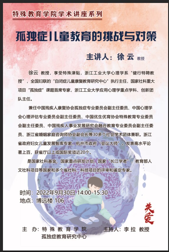 2022年9月30日下午,由特殊教育学院与孤独症教育研究中心共同主办的学术讲座活动在博远楼106进行。本次论坛邀请了来自浙江工业大学的国内著名孤独症教育专家徐云教授亲临讲授,讲座专题为《孤独症儿童教育的挑战与对策》。特殊教育学院院长、孤独症教育研究中心主任李拉教授主持本次讲座,特殊教育学院特殊教育专业孤独症教育方向本科生及部分教师参与了本次活动。
