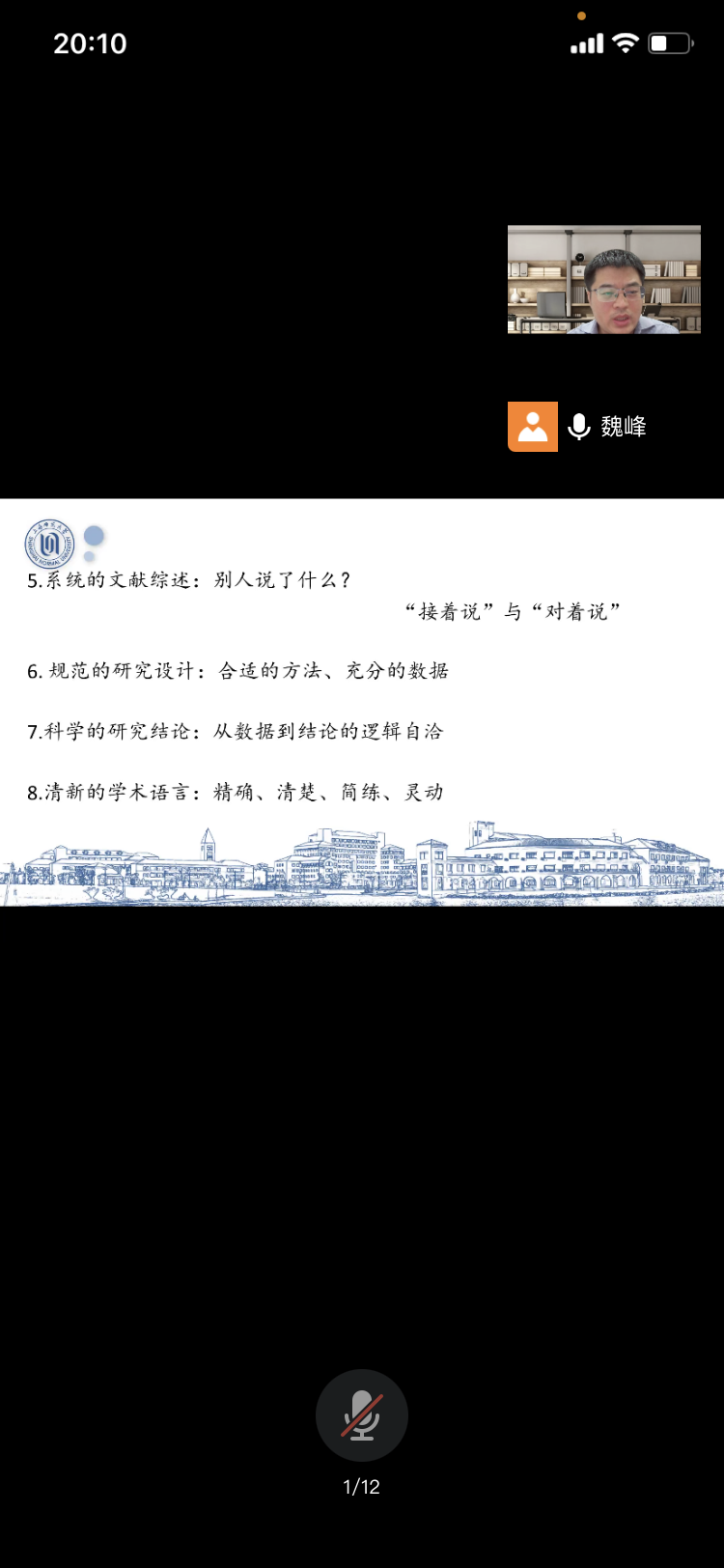 魏峰教授以《“好论文”是怎样炼成的》为主题,从论文选题、题目拟定、文献阅读、文献综述、研究设计、研究结论、学术语言、格式规范等方面展开,向同学们传授、交流自己的写作经验。魏峰教授特别强调,要想写好论文需要多看文献多思考,尤其要看高质量的文献,关注研究领域中著名的学者,不断加深自己对理论的理解。此外,魏峰教授结合自己撰写学术论文的经验,提出论文需要在修改中完善,在修改中提升质量。
