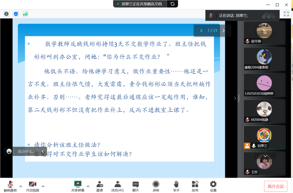 线上教学阶段,师生们准时进入线上课堂。任课老师认真考勤,及时联系了解个别学生未在线的原因。在课堂上,大部分老师都设计了新颖有趣的问题,注重与学生的互动,鼓励学生多思考,积极探索有效的线上课堂教学方式,不断提高线上教学质量。