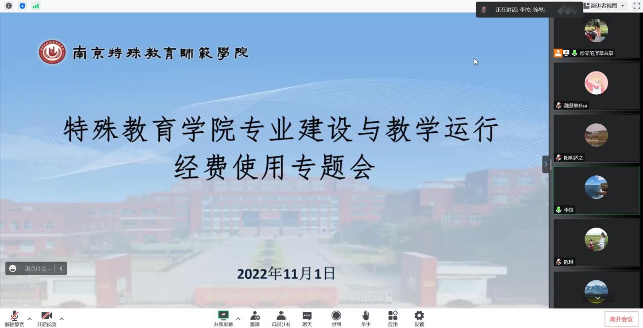 11月1日晚8:00,特殊教育学院召开“专业建设与教学运行经费使用”专题会,会议根据学校关于经费使用的相关精神,汇总现有专业建设及教学运行项目经费使用情况、经费使用政策和学校要求,要求群策群力,将具体工作分工到人。学院党政班子、系主任、学工办负责人和相关行政人员参加会议,会议由特殊教育学院院长李拉主持。