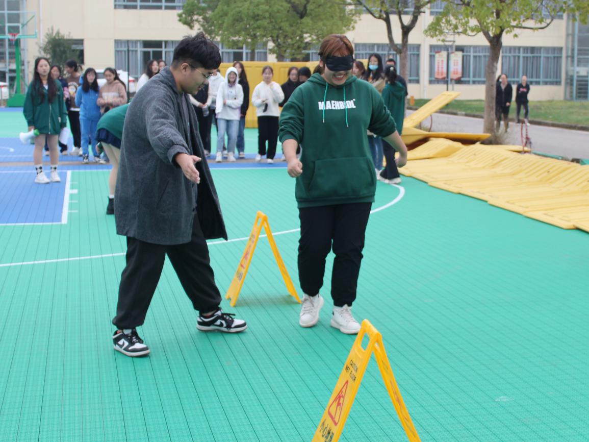第四项运动是“南辕北辙”。这个游戏是两人一组一同站在起点处,指挥者指挥戴眼罩的同学绕过三个障碍物后抵达终点。赛场上有配合默契快速绕过障碍冲过终点的队伍,也有意外频发失误连连的队伍,频繁出现的各种状况使赛场上笑声连连。