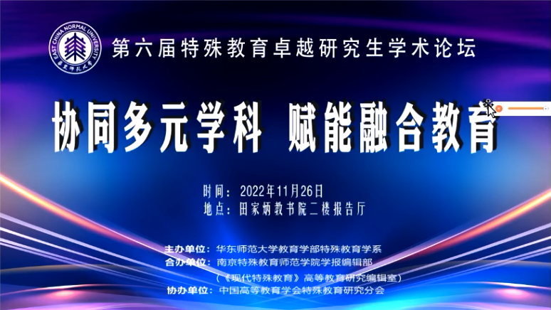 为推动特殊教育领域内跨校、跨学科合作,华东师范大学教育学部特殊教育学系主办,南京特殊教育师范学院学报编辑部(《现代特殊教育》高等教育研究编辑室)合办,中国高等教育学会特殊教育研究分会协办“第六届特殊教育卓越研究生学术论坛”,于近日采用线上线下相结合的方式召开。为进一步推进落实卓越特殊教育教师培养计划,拓展卓越班学子的学术视野,特殊教育学院组织学院20级和21级卓越班全体学生全程参与学习。