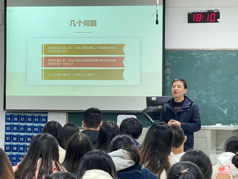 活动初始,李拉教授提出三个问题引发同学们的思考:“我国残疾儿童入学目前主要在普通学校还是特殊教育学校?”,“残疾儿童上学你认为他们应该到普通学校还是特殊教育学校?为什么?”,“什么是融合教育?”。在与同学们的交流互动中,李拉教授引出此次讲座的主要内容,并依次进行深入讲解。