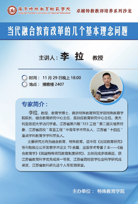 为深入贯彻党的二十大精神,强化特殊教育普惠发展,培养教育情怀深厚、专业基础扎实、勇于创新教学、具有终身学习发展能力的卓越特殊教育教师,特殊教育学院于11月29日18:00在博雅楼2407举办卓越教师培养专题沙龙。学院院长、教育学博士李拉教授受邀做主题报告《当代融合教育改革的几个基本理念问题》,与同学们交流研讨。活动由21级卓越班张妍妍主持,学院20级和21级卓越班同学全员参加。