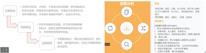 在活动过程中,选手们结合PPT演示文稿,对自我认识和外部环境进行全面分析,提出自己的职业目标、发展路径和行动规划,并从可操作性和现实意义等方面进行细致阐述。陈一依同学从特殊教育的就业前景出发分析出特殊教育专业近几年就业前景可观,但是挑战不断;徐楠同学采访特殊教育相关从业人员如来学校招聘的机构负责人、公办培智学校生活语文老师、五年从业经验的康复机构感统训练师等,结合自身情况对职业生涯做出规划;史雪婷同学为自己设置近期规划、中期规划、远期规划,将不断提高自己,增长各方面的见识,提升阅历,越来越专业化,在自己热爱的领域发光发热;王熙恬同学结合自身潜在优势与劣势对自己职业生涯做出规划……选手们满怀激情地讲述自己在职业生涯中的规划和想法,一份份结构完整,脉络清晰,体现选手们清晰的自我认知。