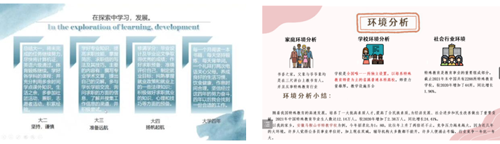 在比赛中,陆起华同学根据自身情况分享了未来的工作方向,依次从视障、听障、培智和孤独症这四个部分分析现阶段国内研究的发展状况,明确今后的目标;张妍妍同学向大家展示自己的职业兴趣类型,对自己的优缺点进行全面的分析与总结,并提出优化建议;赖美琴同学对自己大学的各个阶段进行规划,明确每个阶段的目标,并表示将不断丰富自己的专业知识,在特殊教育领域发光发热;陈玥同学对自己现阶段所处的环境进行分析,积极认识自我,有针对性地对特殊教育职业进行规划……选手们对教师职业的认同与热爱,对特殊教育职业的分析与计划,充分展示了新时代师范生的风采。