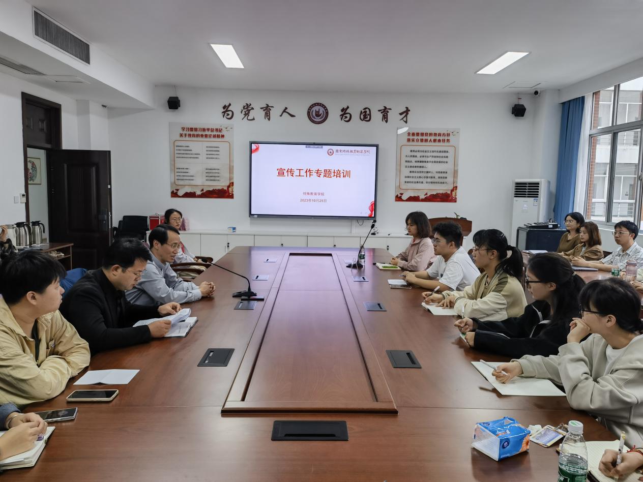 为进一步加强和规范学院新闻宣传工作,为学院高质量发展营造良好的舆论环境,特殊教育学院于10月25日下午在博雅楼2401会议室举办宣传工作专题培训会。本次培训特邀学校党委宣传部袁姝老师主讲,学院党总支书记叶亮、副书记李鹏出席会议,学院辅导员老师、青年教师代表、学院团总支办公室和学生会宣传部、新媒体中心以及各班级宣传委员参加会议。
