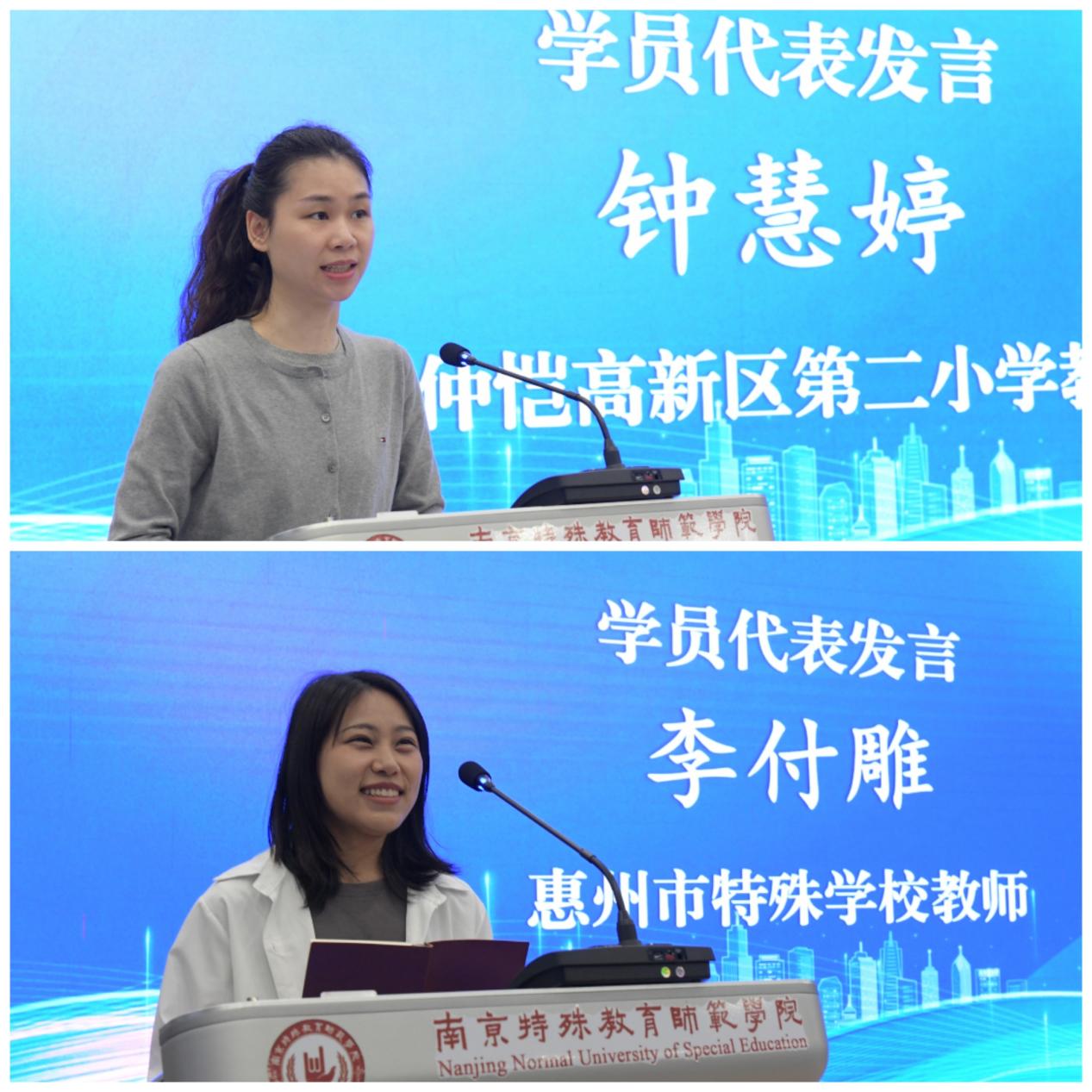会上,学员代表钟慧婷、李付雕两位老师先后发言。她们表示,非常荣幸能参加此次培训,将与同行们全情投入学习,共同探讨融合教育的有效路径。她们期待通过培训,能够掌握更多实用技能和教育教学策略,更好地服务于特殊学生,促进他们的全面发展,为惠州市融合教育事业的进步贡献力量。