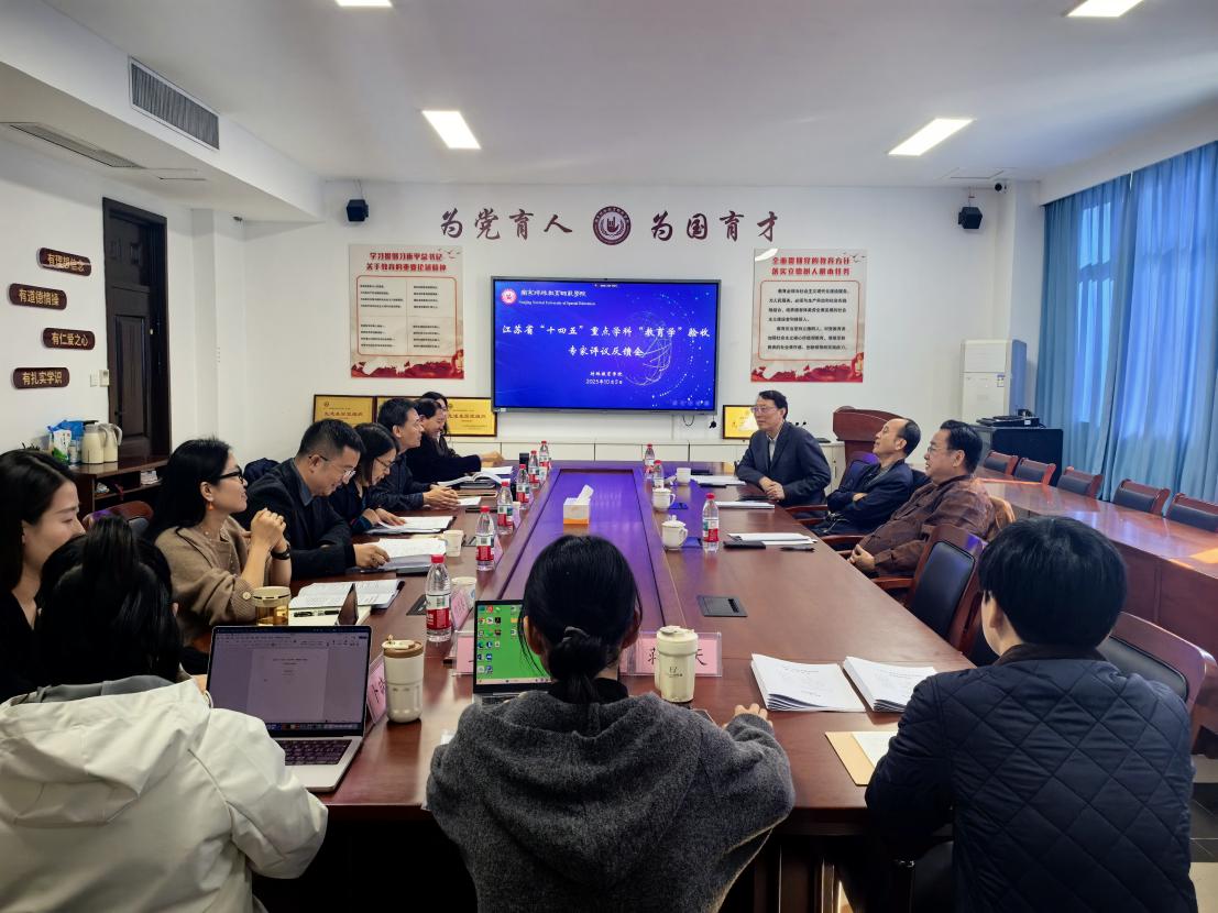 为深入推进教育学学科建设,全面总结“十四五”重点学科“教育学”建设成果,提前谋划“十五五”教育学重点学科建设方向与目标,2025年11月5日,特殊教育学院在博雅楼2401会议室召开“江苏省‘十四五’重点学科‘教育学’验收专家评议反馈会”。中国教育学会特殊教育分会副理事长丁勇、南京师范大学教育科学学院教授胡建华、南京特殊教育师范学院特聘教授徐云应邀出席。特殊教育学院院长李拉、教育科学学院院长刘新学、康复科学学院院长王姣艳、校科研处副处长张伟锋、特殊教育学院副院长何燕春及王辉教授和学院部分博士教师共同参会。