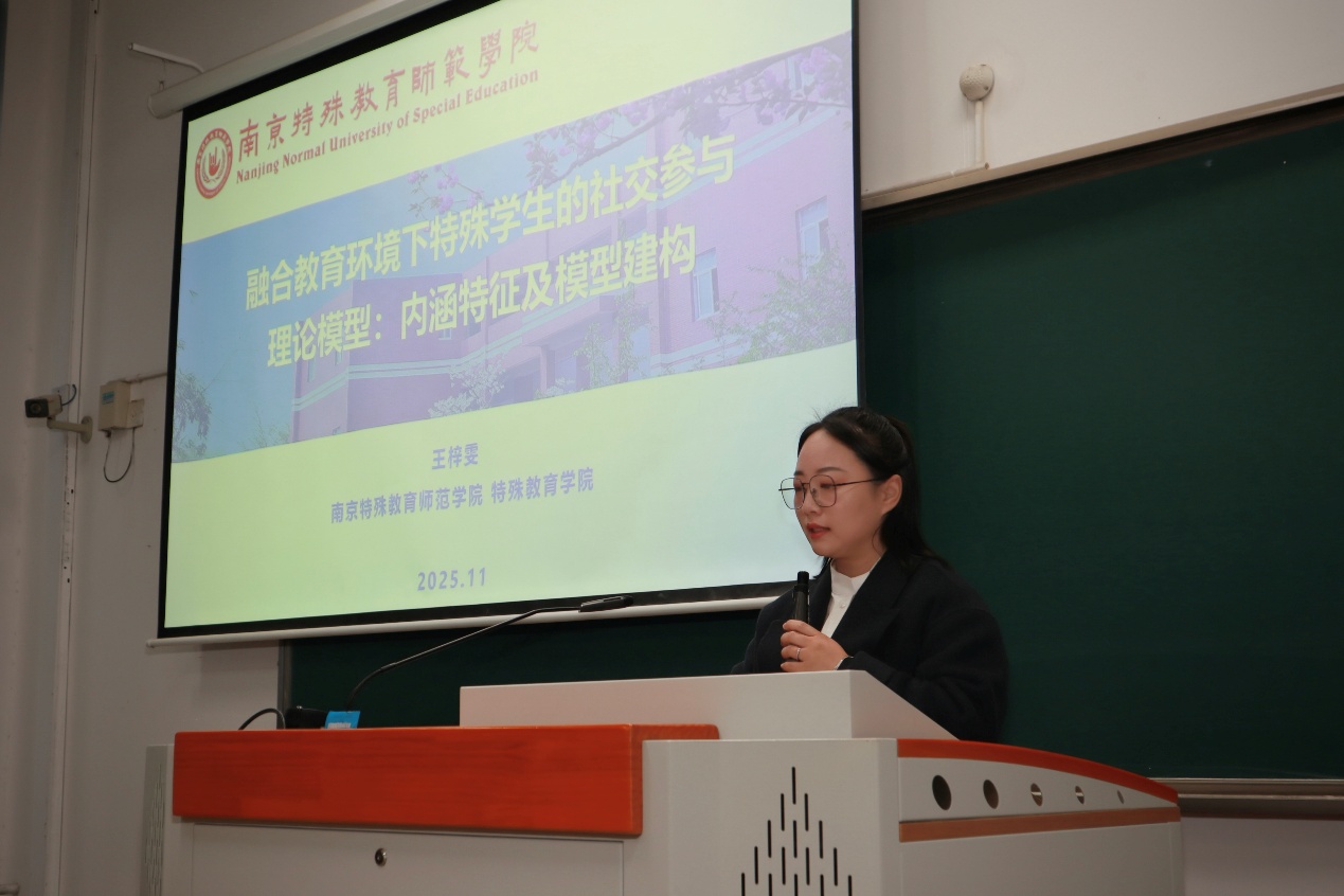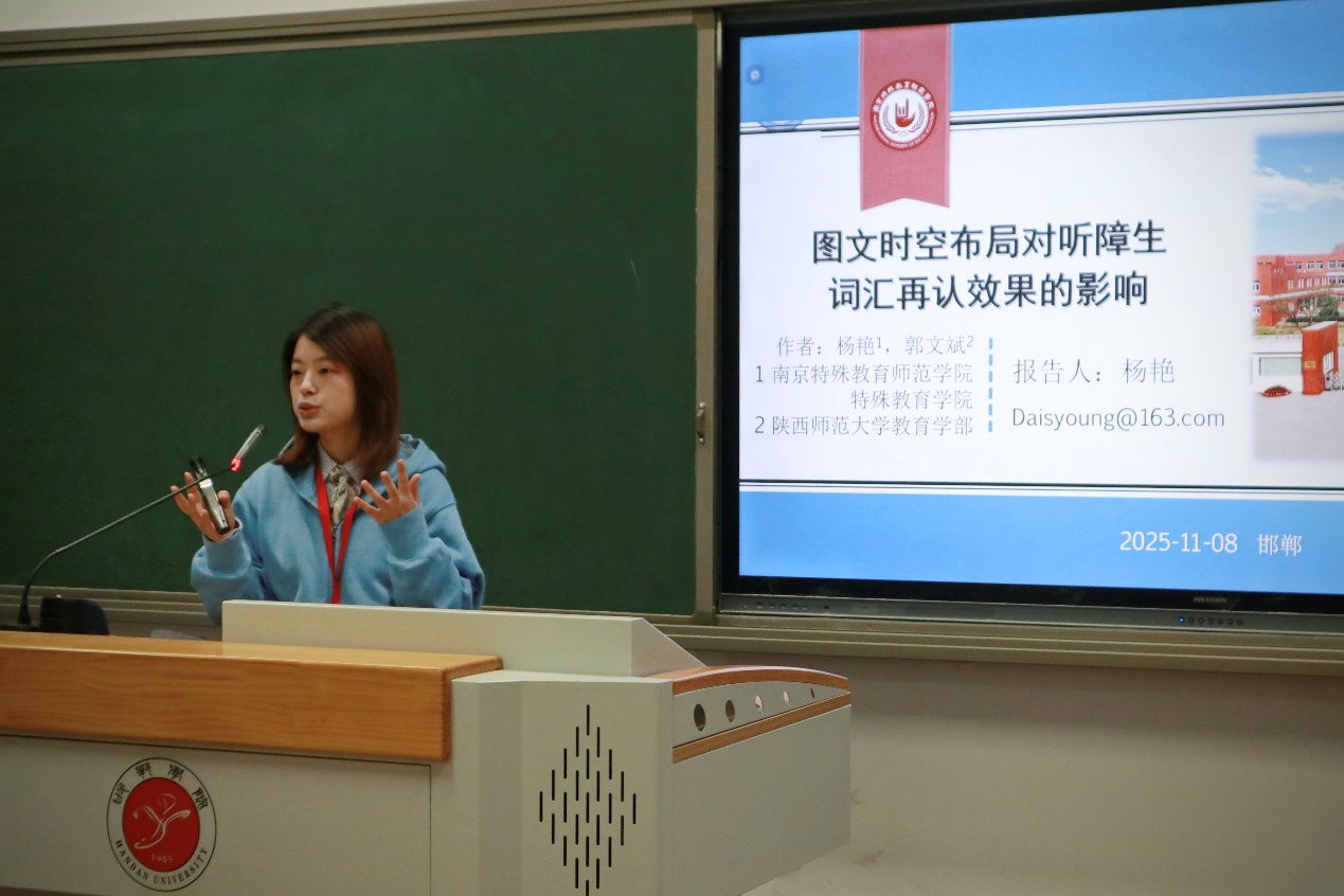 学院教师王梓雯和杨艳在分会场作学术分享。王梓雯老师以《融合教育环境下特殊学生的社交参与理论模型:内涵特征及模型构建》为题,系统阐释融合教育中的社交支持策略;杨艳老师通过《图文时空布局对听障生词汇再认效果的影响》研究,分享优化听障学生语言教学的新视角。两位老师立足实践,为特殊教育方法探索提供有益借鉴。 会议期间,学院师生踊跃参与研讨,与同行互学互鉴,汲取先进经验。邯郸“兼容并蓄”的文化底蕴,与特殊教育“有教无类”的理念相映成趣,为交流增添厚重感。此次参会深化了学院对行业发展趋势的认知,拓宽了学术视野。