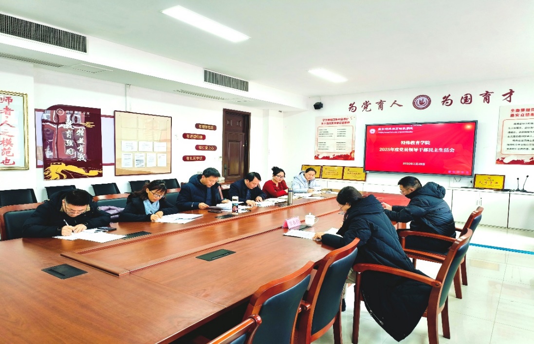 1月20日上午,特殊教育学院召开2025年度党员领导干部民主生活会。学院全体班子成员和党委委员参加会议,会议由章小军同志主持。校党委常委、副校长吴彬江,校纪委委员、机关党委书记宋春秋到会督导。