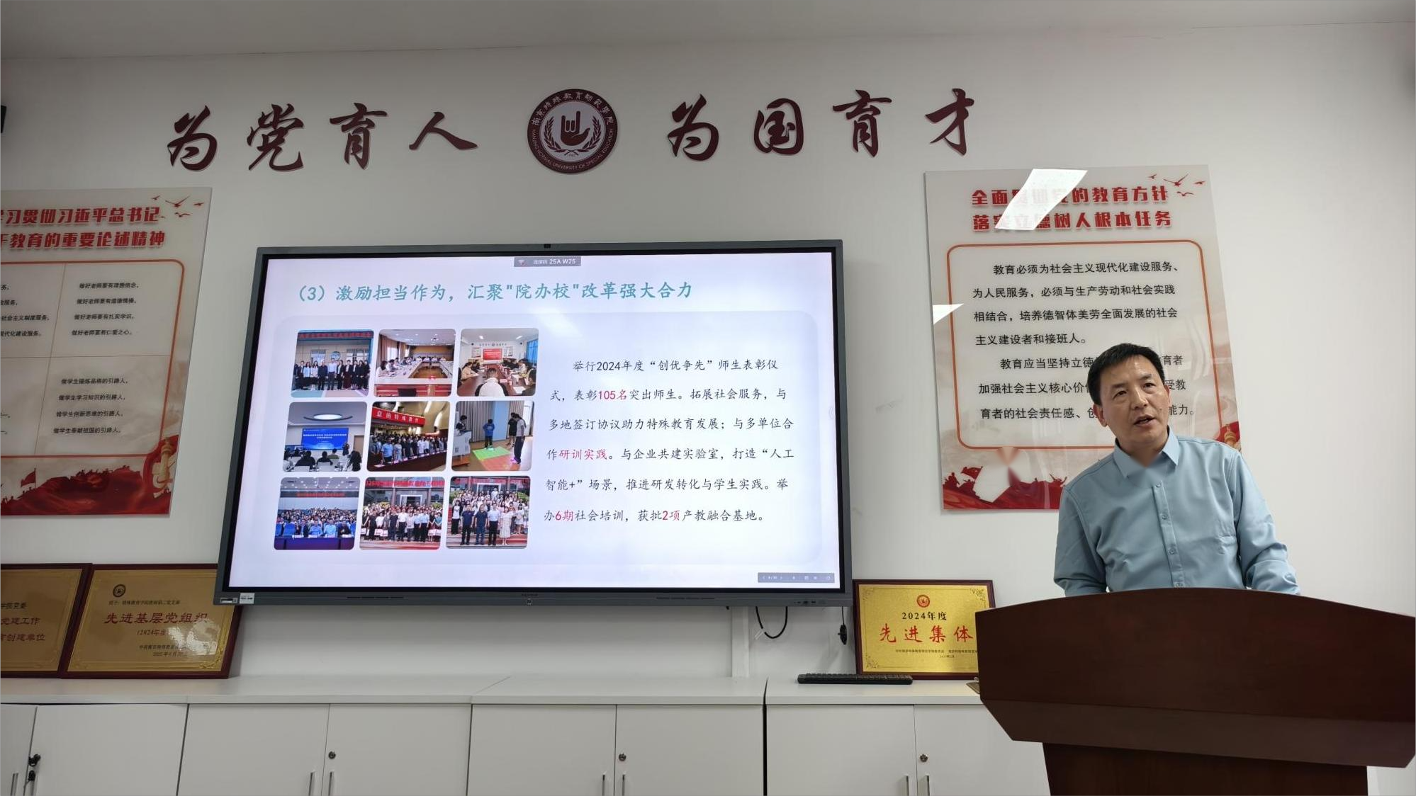 大会伊始,李拉院长作学院2025年工作总结报告。报告以翔实的数据、鲜活的案例展现了学院过去一年在党建引领、学科建设、人才培养、科学研究、社会服务等方面取得的高质量成果。党建工作方面,学院党委始终坚持把政治建设摆在首位,充分发挥党建引领力,学生第二党支部获评“全省高校党建工作创新案例”,教师第二党支部获评校级先进基层党组织;学科建设方面,学院与马来西亚奎斯特国际大学联合培养研究生项目实现了在校培养“零的突破”;教育硕士点申报工作扎实推进,特殊教育、孤独症儿童教育两个省级品牌专业建设蹄疾步稳。“智慧融合教育实验室”和“孤独症儿童教育实验室”建成并高效投入使用;人才培养方面,特教学子们在学科竞赛、体育竞技中屡获佳绩,2025届毕业生年终就业去向落实率超95%,位居全校前列;教学科研方面,赵晓驰教授斩获全国高校教师教学创新大赛二等奖,实现学校历史性突破;王辉教授团队的课程入选国家级一流本科课程;王澜淇博士在国际权威SSCI期刊发表高水平论文;李拉院长获教育部重点课题;学院教师包揽江苏省哲社科优秀成果奖多项荣誉;李拉、杨克瑞教授双双入选中国知网高被引学者Top1%。此外,学院全年横向到账经费达289万元,成功举办6期社会培训班,获批2个产教融合基地等。