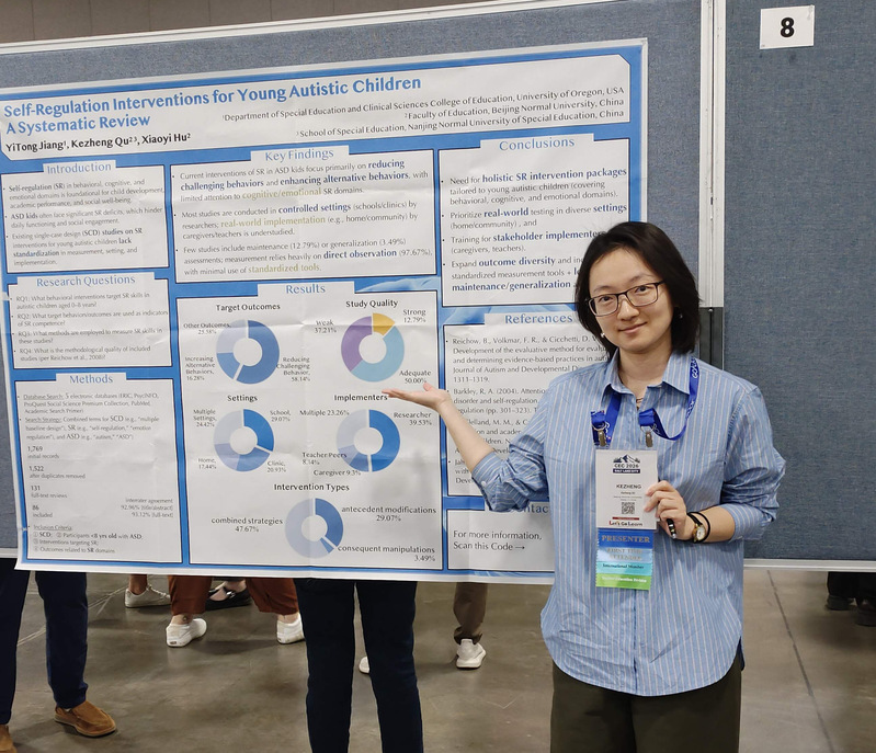屈可铮老师全程参与前沿学术报告,系统学习循证实践、功能性行为评估、创伤知情干预、特教师资专业发展等国际先进经验,并在会议期间完成《自我调节干预措施对小龄孤独症儿童的影响:一项系统综述》海报展示,与多国同行深入交流。