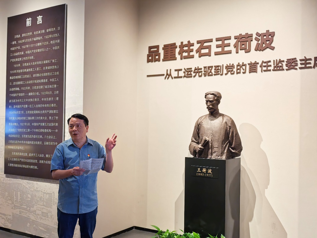 在王荷波同志的雕塑前,学院党委书记为大家分享了初心故事,讲述王荷波“从浦镇机厂走出的工人领袖”到“中央监委首任主席”的革命轨迹,强调“王荷波用生命诠释的‘品重柱石’风范,正是特教工作者所需要的精神钙质。”王荷波(1882年-1927年),原名王灼华,福建福州人,1922年6月加入中国共产党,成为南京地区第一个共产党员。1927年参加党的八七会议,当选临时中央政治局委员,中共中央北方局书记。同年因叛徒出卖遇害,终年45岁。他是中国工人运动的杰出先驱,是我党第一位工人出身的中央委员,第一个纪律检查机构中央监察委员会的首任主席。在王荷波的红色生涯中,他始终严于律己,初心不改,被称作“品重柱石”。在中央工作期间,王荷波始终保持着艰苦朴素、廉洁奉公的革命家作风,备受尊敬。在生命的最后时刻,高呼“中国共产党万岁”,他牺牲前唯一嘱托,是请求党组织对他的子女加强革命教育,千万别走和他相反的道路。荷风飘万里,波光映千秋。王荷波同志短暂而伟大的一生,许党报国的光辉事迹和高贵品质成为宝贵精神财富,为后人永远缅怀铭记,那一颗至死不渝的初心激励着我们薪火相传,赓续绵延。