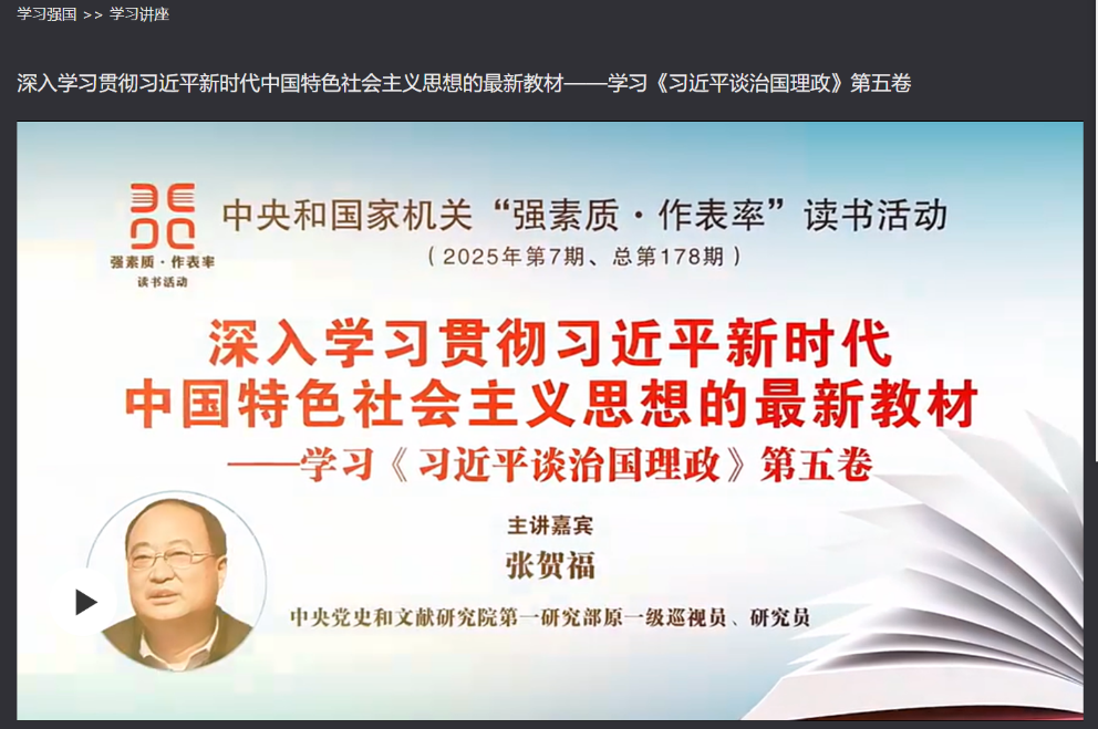 会上,通过“学习强国”平台聆听了专题辅导报告:深入学习贯彻习近平新时代中国特色社会主义思想的最新教材——学习《习近平谈治国理政》第五卷(视频讲座)。